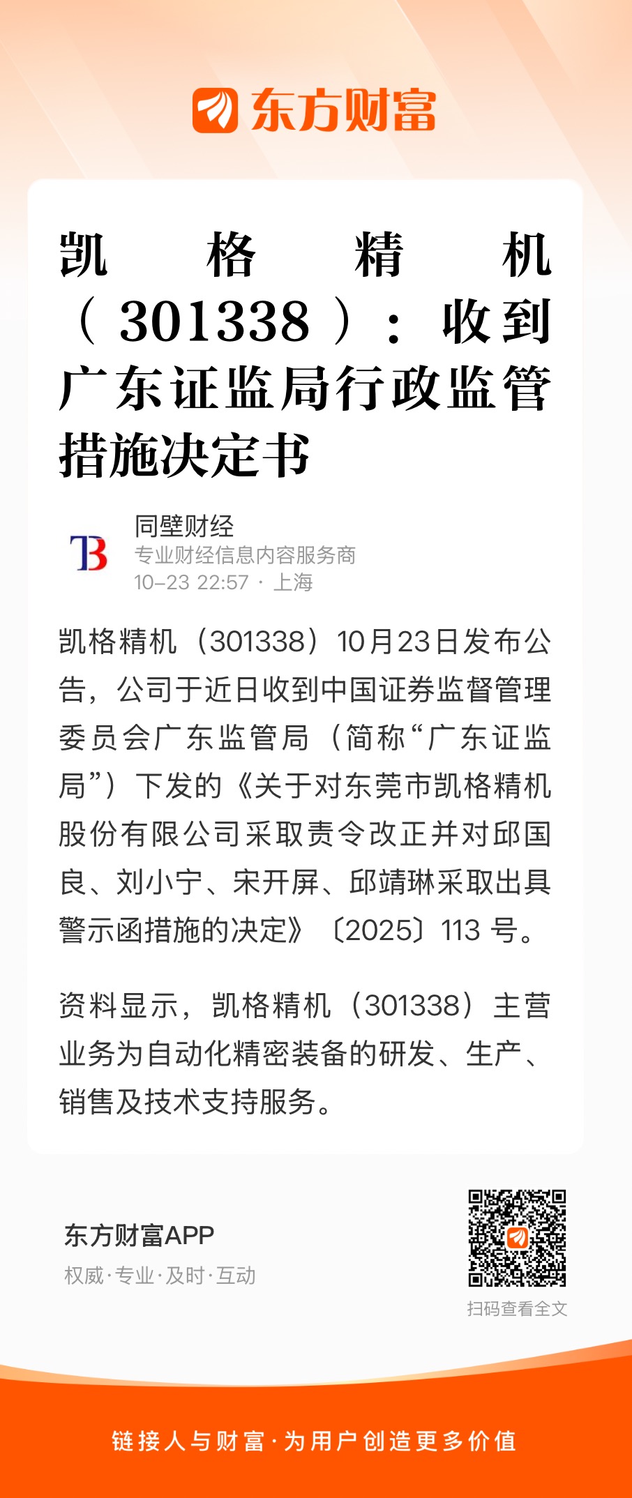 凯格精机(301338)10月23日发布公告,公司于近日收到中国证券监督管理委员会广东监管局(简称“广东证监局”)下发的《关于对东莞市凯格精机股份有限公司采取责令改正并对邱国良、刘小宁、宋开屏、邱靖琳采取出具警示函措施的决定》〔2025〕113 号。
