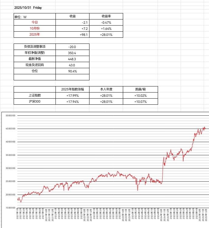 2025.10.31周五今天-2.1w(-0.47%),2025年+98.1w(