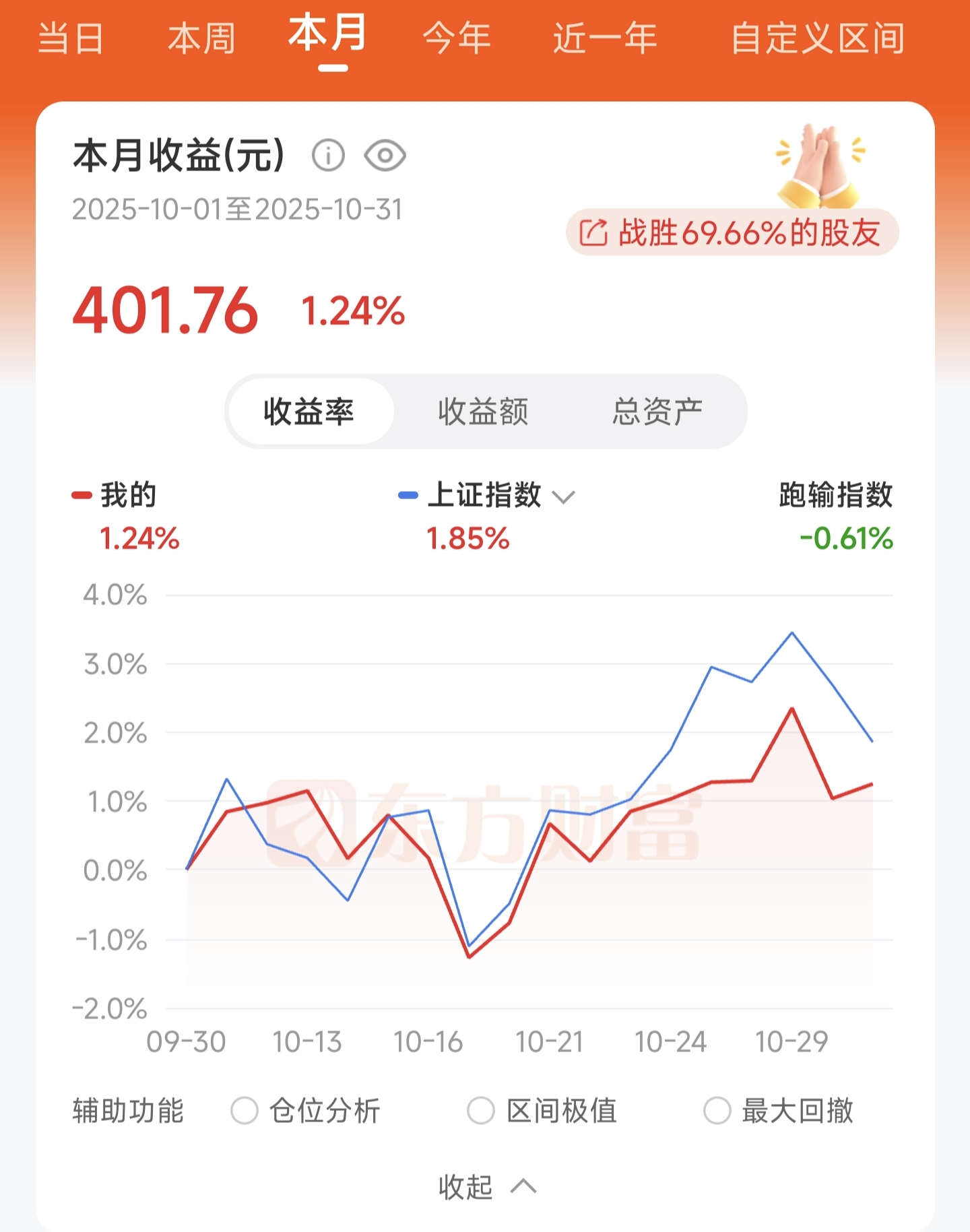 本人本月收益401.76元,收益率1.24%,战胜69.66%的股友。