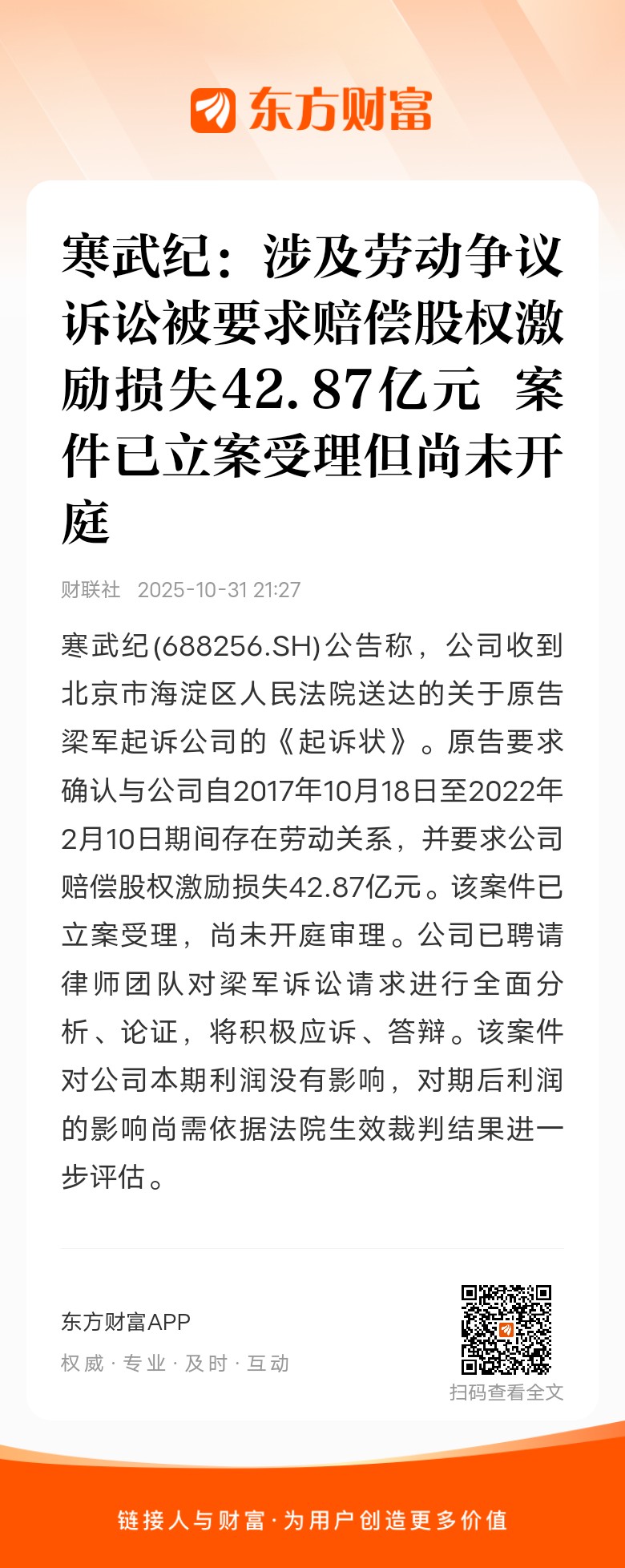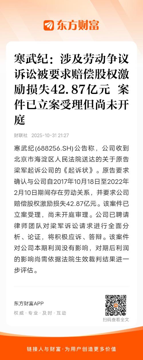 寒武纪(688256.SH)公告称,公司收到北京市海淀区人民法院送达的关于原告梁军起诉公司的《起诉状》。原告要求确认与公司自2017年10月18日至2022年2月10日期间存在劳动关系,并要求公司赔偿股权激励损失42.87亿元。该案件已立案受理,尚未开庭审理。公司已聘请律师团队对梁军诉讼请求进行全面分析、论证,将积极应诉、答辩。该案件对公司本期利润没有影响,对期后利润的影响尚需依据法院生效裁判结果进一步评估。