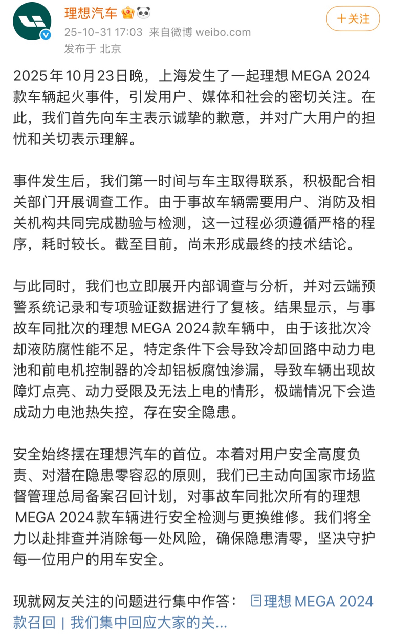 理想汽车于10月31日傍晚正式发布致歉声明。声明中,理想汽车首先向车主表达了诚挚歉意,并解释了调查耗时较长的原因。同时,其内部调查分析已初步锁定问题根源:与事故车同批次车辆因冷却液防腐性能不足,特定条件下会导致冷却回路中动力电池和前电机控制器的冷却铝板腐蚀渗漏,导致车辆出现故障灯点亮、动力受限及无法上电的情形,极端情况下会造成动力电池热失控,存在安全隐患。