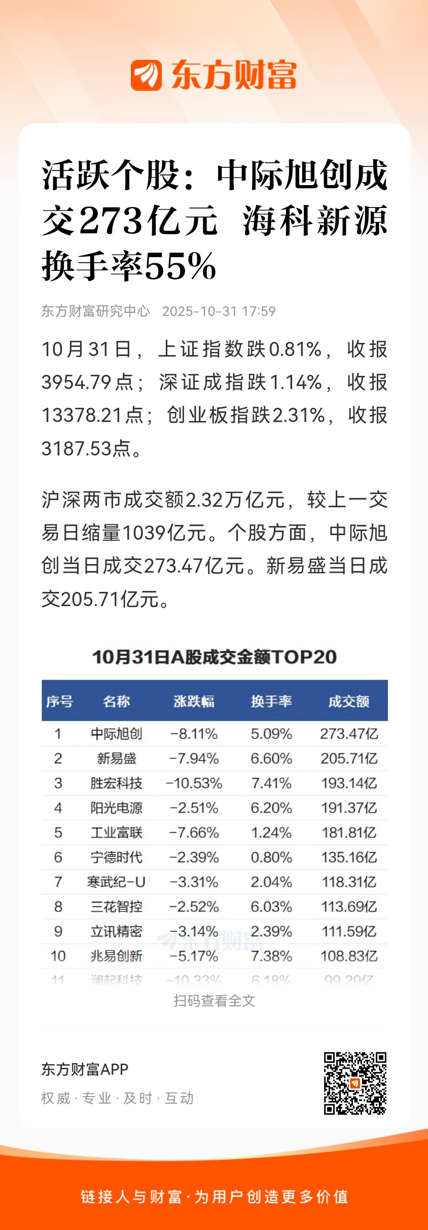 10月31日,上证指数跌0.81%,收报3954.79点;深证成指跌1.14%,收报13378.21点;创业板指跌2.31%,收报3187.53点。