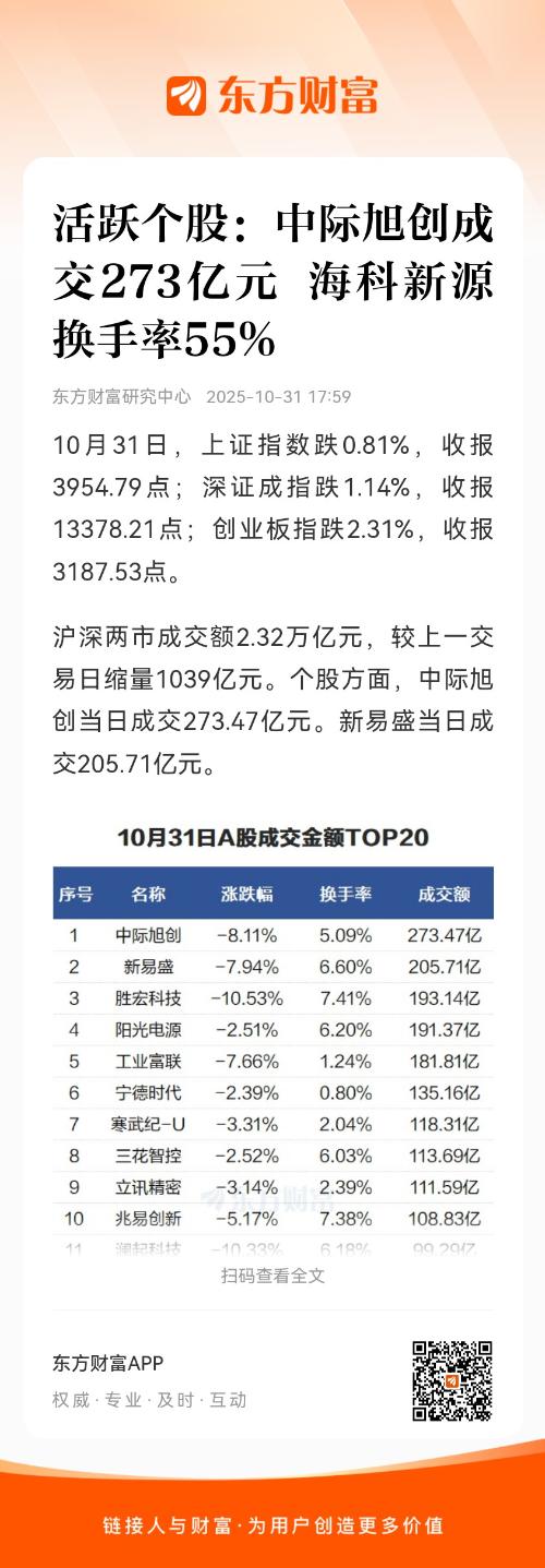 沪深两市成交额2.32万亿元,较上一交易日缩量1039亿元。个股方面,中际旭创当日成交273.47亿元。新易盛当日成交205.71亿元。