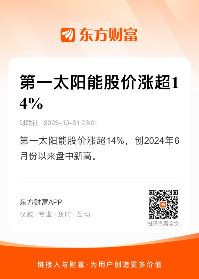 第一太阳能股价涨超14%,创2024年6月份以来盘中新高。