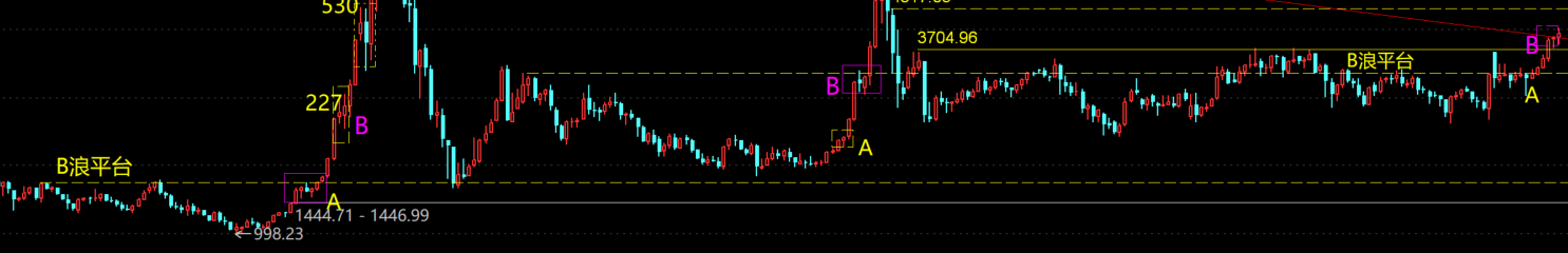 历史A区域都是在上个熊市的下跌B浪平台做休整,然后 开启一段趋势升浪,当超越或者遭遇上个牛市顶部的时候,在其高点上下的位置都再次出现了休整区域,也就是图标中的B区域。B区域之后就又是一段升浪,我称之为中期主升浪!!!