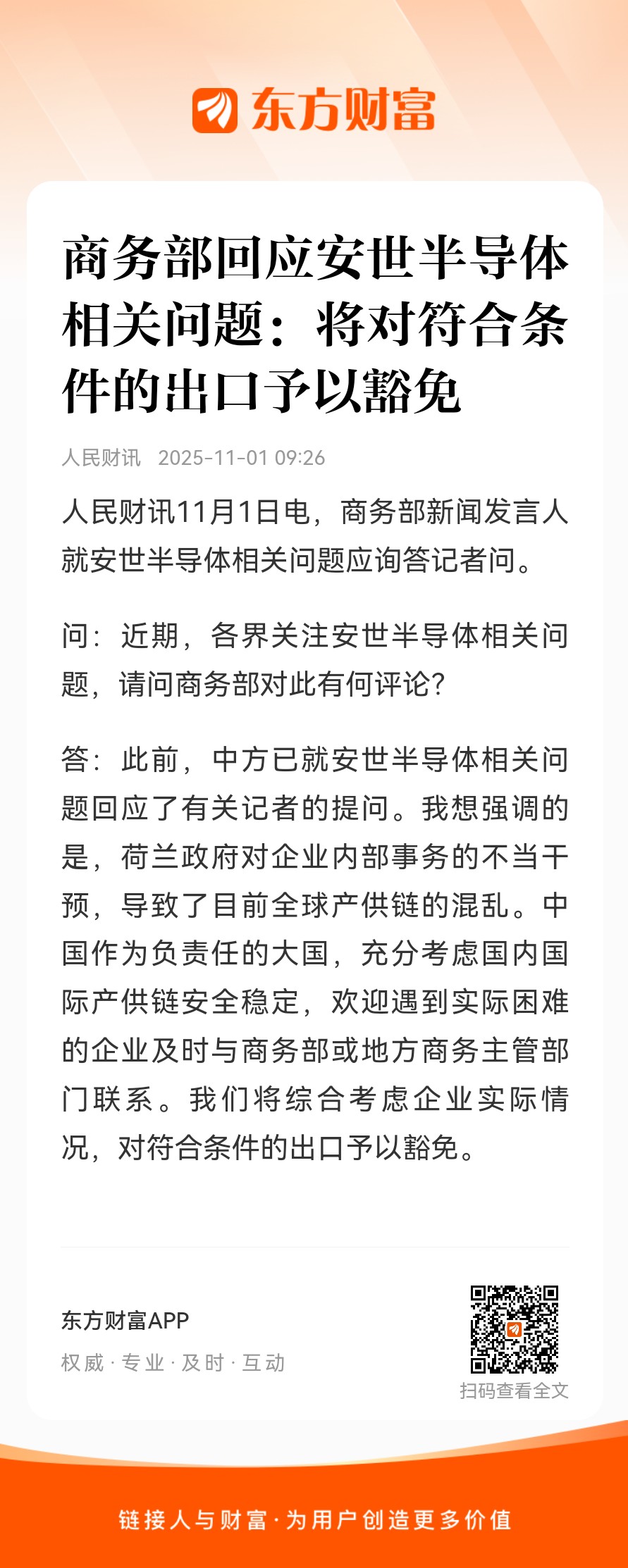 人民财讯11月1日电,商务部新闻发言人就安世半导体相关问题应询答记者问。