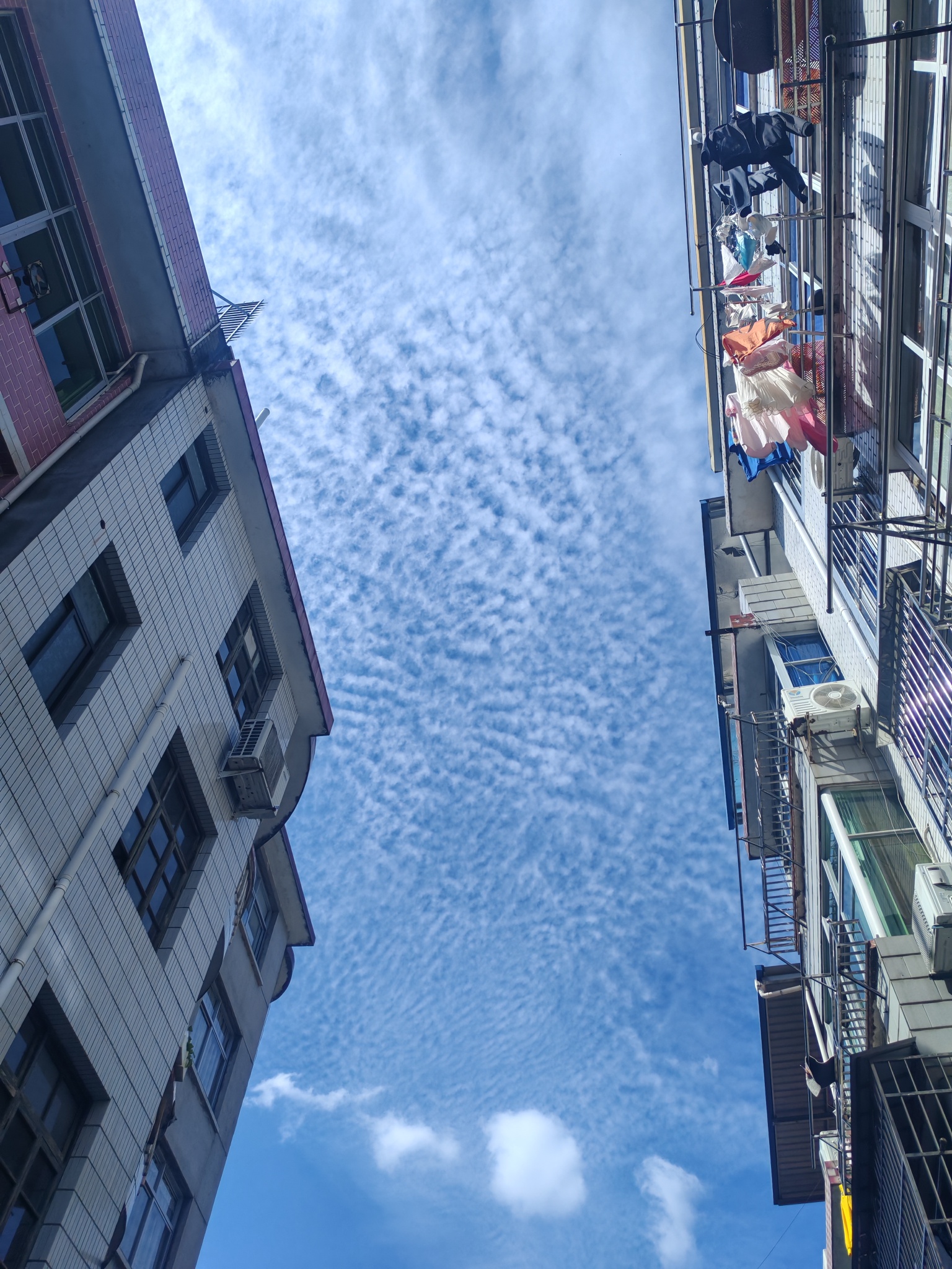自家屋外即景(一)山区县城,木讷的小楼,积极的浮云,…天空很美,丝丝棉絮。(二)