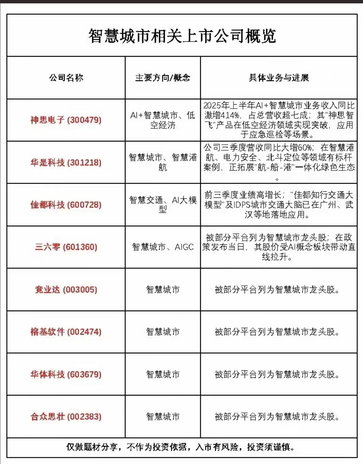 智慧城市:相关上市公司概览!智慧城市涵盖多个方面,主要包括核心特征、技术支柱、应