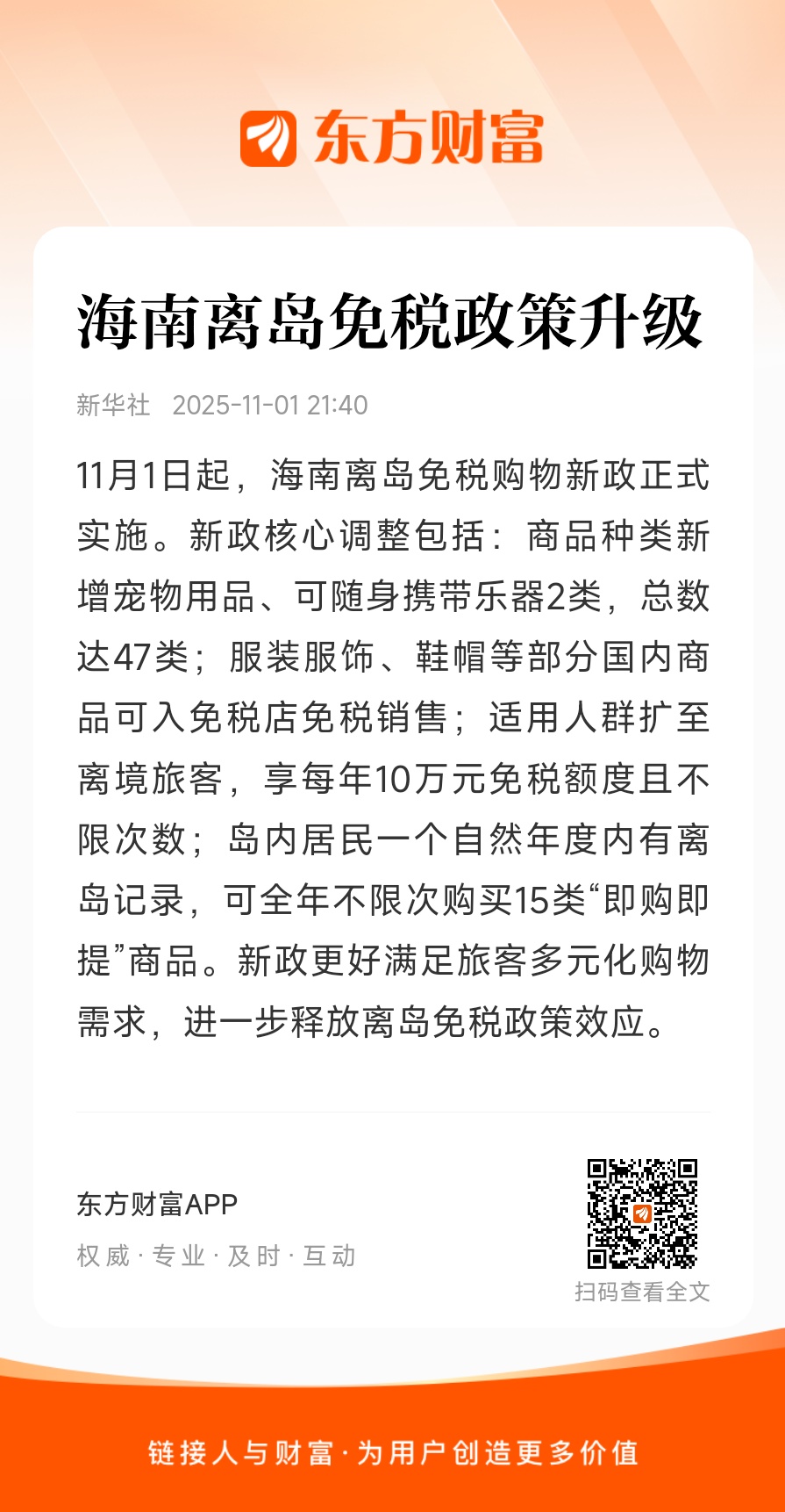 11月1日起,海南离岛免税购物新政正式实施。新政核心调整包括:商品种类新增宠物用品、可随身携带乐器2类,总数达47类;服装服饰、鞋帽等部分国内商品可入免税店免税销售;适用人群扩至离境旅客,享每年10万元免税额度且不限次数;岛内居民一个自然年度内有离岛记录,可全年不限次购买15类“即购即提”商品。新政更好满足旅客多元化购物需求,进一步释放离岛免税政策效应。