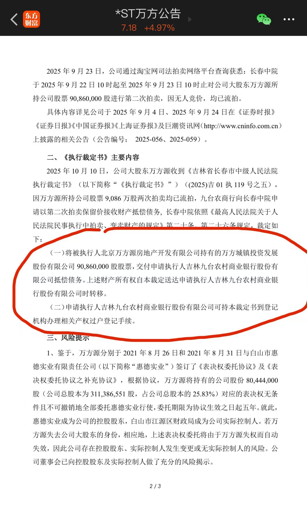 2025年10月11日ST万方发布了《关于公司收到执行裁定书》的公告里边重点表述了因二次流拍(其中第二次其实是有人报名的,个人感觉就是九台或者吉林金控),九台农商行向长春中院申请以第二次拍卖保留价接受财产抵偿债务,简单来说就是万方的股权划转至九台农商行。那么,大家很关心的一个问题就是股权什么时候划账,为什么还没有公告。其实,股权现在已经划转完了,九台农商行现在已经是ST万方的大股东,请看下图