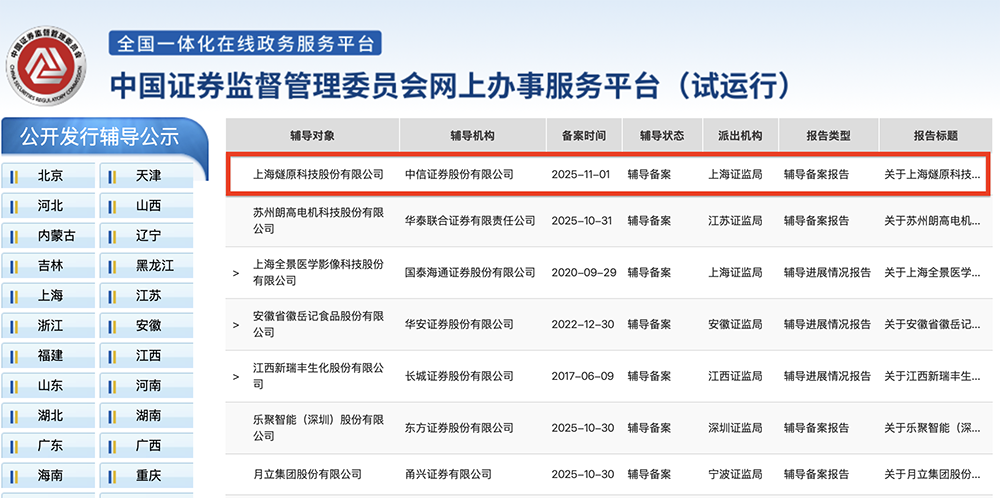 11月1日消息,据证监会官网披露,上海AI芯片领域的龙头企业燧原科技,已于上海证监局完成辅导备案登记,此次辅导机构选定为中信证券。