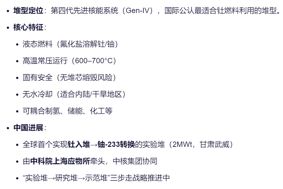 11月1日,中国钍基熔盐堆(TMSR)实现“钍铀燃料转换”技术突破,标志着第四代核能系统从实验走向工程化的重要一步。