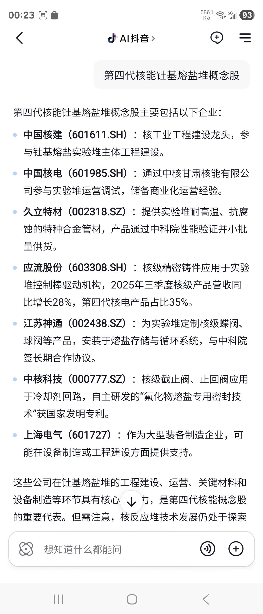 一、【核心直接受益】——深度参与TMSR研发或关键设备供应 1. 上海电气(601727) 逻辑 :中国核电设备三大巨头之一,具备高温合金、熔盐泵、热交换器、控制系统等关键设备制造能力。 进展 :已参与中科院TMSR专项设备研制,旗下核电集团具备核级设备资质。 弹性 :若未来建设示范堆(100MW级),单堆设备价值量预计超10亿元。 2. 应流股份(603308) 逻辑 :国内核一级主泵泵壳核心供应商,产品用于华龙一号等三代堆;已布局高温合金部件,适用于熔盐堆高温腐蚀环境。 亮点 :2024年公告投资建设“高端部件智能制造项目”,明确瞄准第四代核能。 市场表现 :2024年以来涨幅超150%,被机构视为“小而美”核能标的。 3. 江苏神通(002438) 逻辑 :核电阀门龙头,产品覆盖中核、中广核;熔盐堆需大量耐高温、耐腐蚀特种阀门(如熔盐截止阀、调节阀)。 优势 :已具备镍基合金阀门制造能力,技术可迁移至TMSR系统。