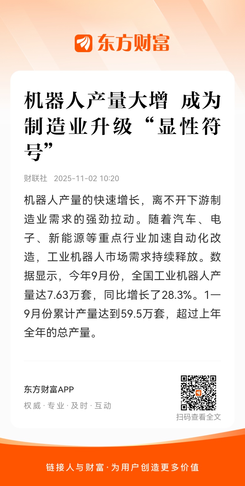 机器人产量的快速增长,离不开下游制造业需求的强劲拉动。随着汽车、电子、新能源等重点行业加速自动化改造,工业机器人市场需求持续释放。数据显示,今年9月份,全国工业机器人产量达7.63万套,同比增长了28.3%。1—9月份累计产量达到59.5万套,超过上年全年的总产量。