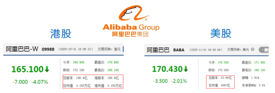 综上,截至2025年10月31日,阿里巴巴的总市值为3.152万亿港元或4067亿美元,并不是两者相加,其总市值还远远低于腾讯的总市值(5.758万亿港元)。