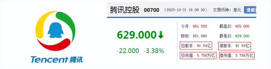 根据东方财富网实时数据,腾讯控股的总股本为91.54亿股,而且全是港股,所以总市值为629.000元/股*91.54亿股=5.758万亿港元。