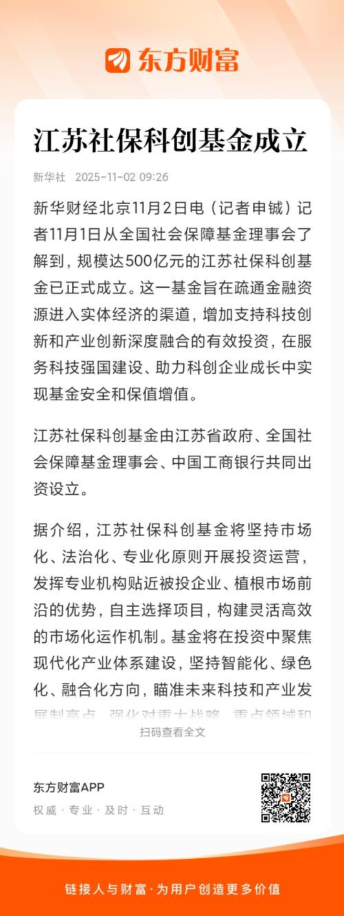 新华财经北京11月2日电(记者申铖)记者11月1日从全国社会保障基金理事会了解到,规模达500亿元的江苏社保科创基金已正式成立。这一基金旨在疏通金融资源进入实体经济的渠道,增加支持科技创新和产业创新深度融合的有效投资,在服务科技强国建设、助力科创企业成长中实现基金安全和保值增值。