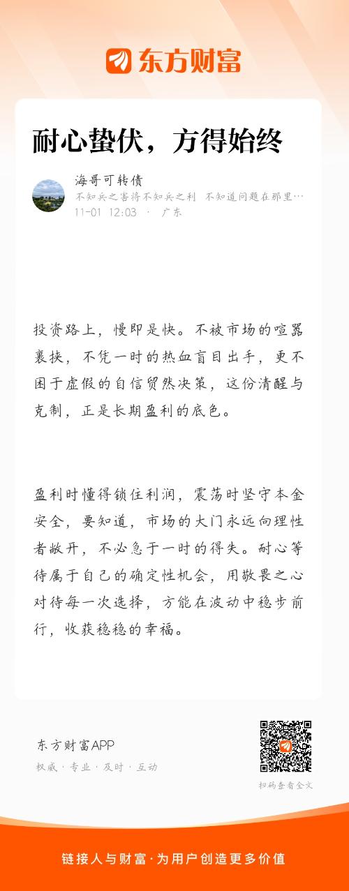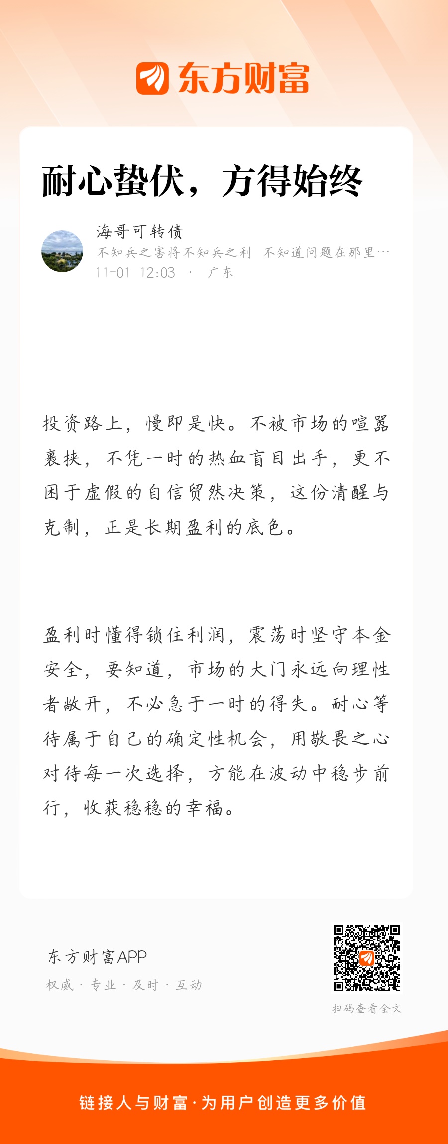 投资路上,慢即是快。不被市场的喧嚣裹挟,不凭一时的热血盲目出手,更不困于虚假的自信贸然决策,这份清醒与克制,正是长期盈利的底色。