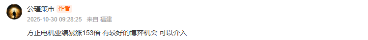 方正电机在上周四涨停后周五放量留长上影仍收涨不错,涨停后的抛压已有效释放、换手充分,1531倍业绩暴增的硬支撑没减,向上预期没走完。今天重点看能否稳住节奏、延续强势,凭着业绩利好的底气,大概率有望继续向上打开空间,咱们持仓跟着节奏拿稳,重点盯量能和短期均线的支撑就好。