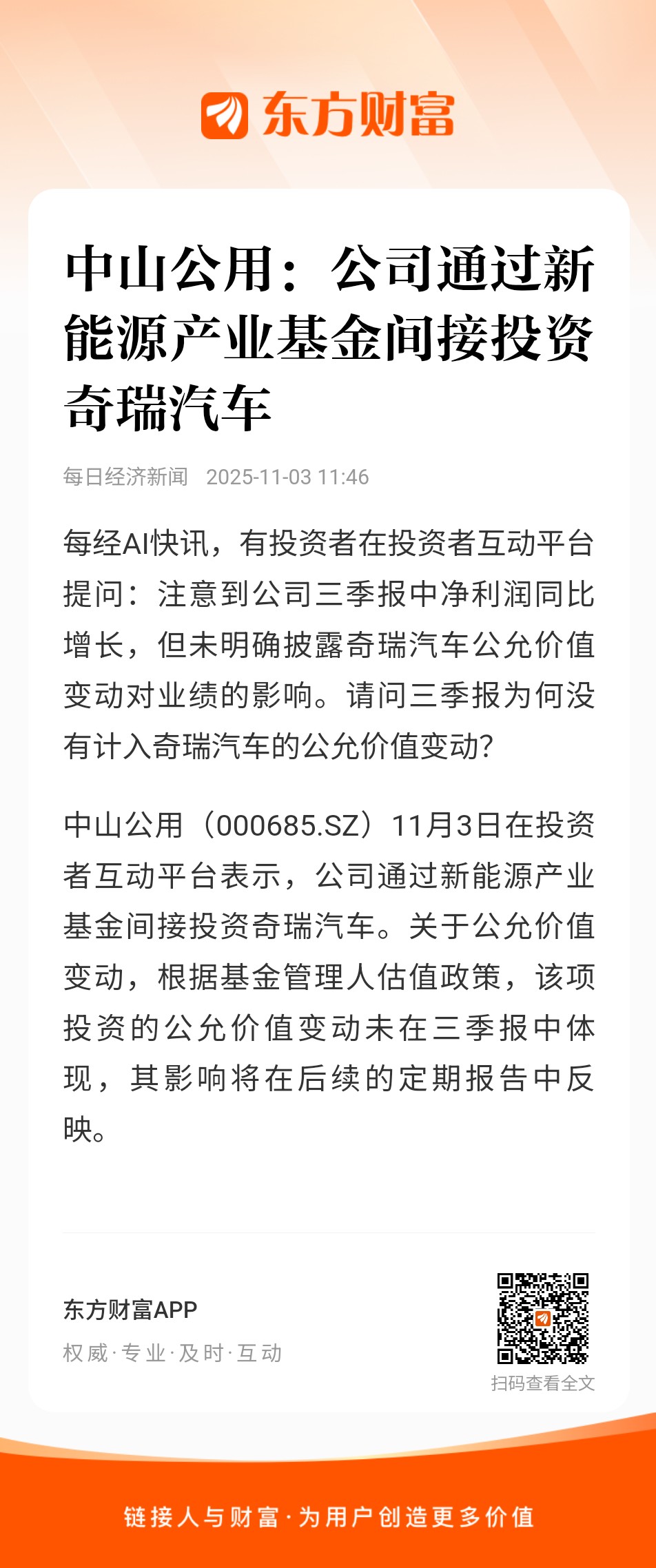 中山公用(000685.SZ)11月3日在投资者互动平台表示,公司通过新能源产业基金间接投资奇瑞汽车。关于公允价值变动,根据基金管理人估值政策,该项投资的公允价值变动未在三季报中体现,其影响将在后续的定期报告中反映。