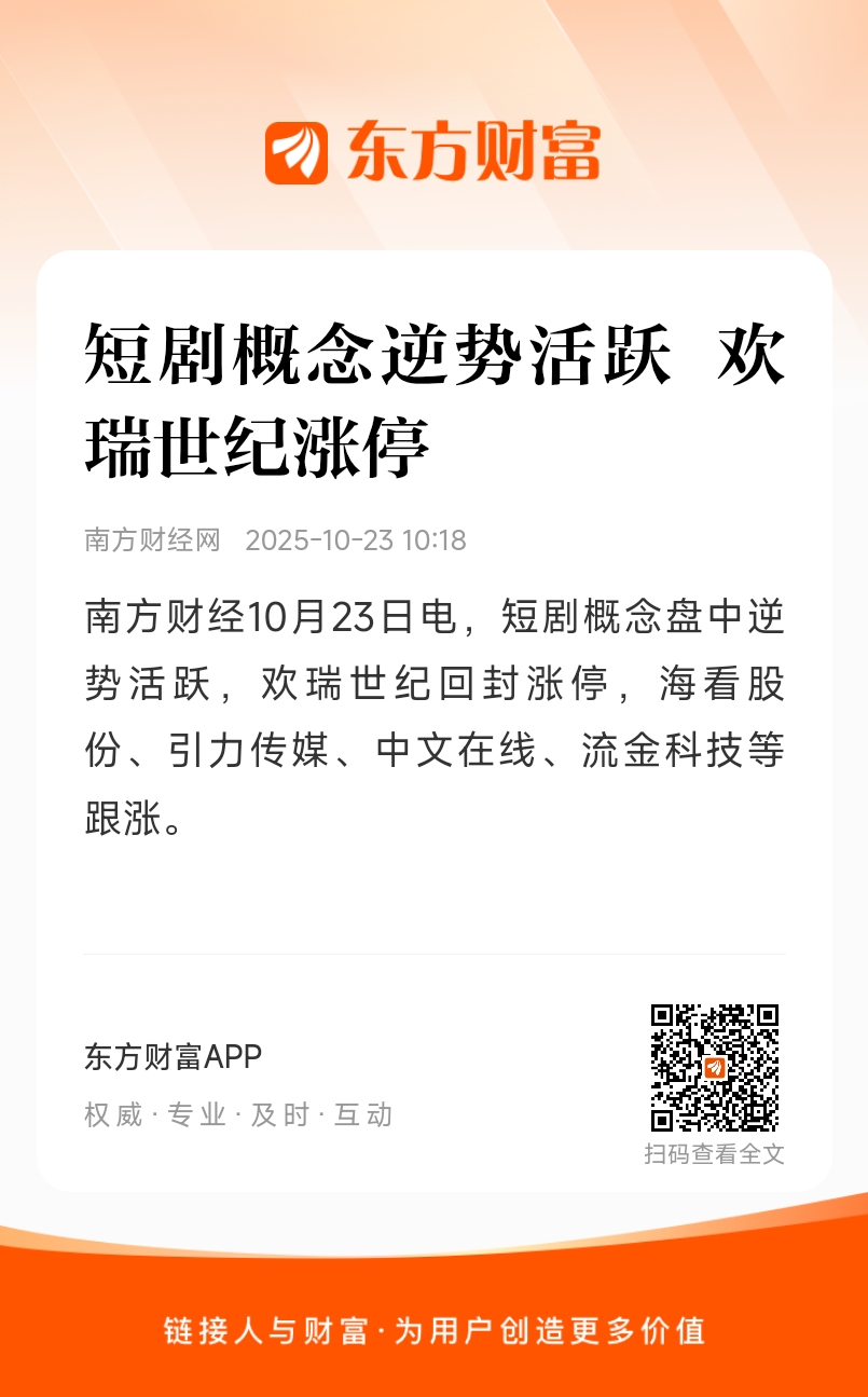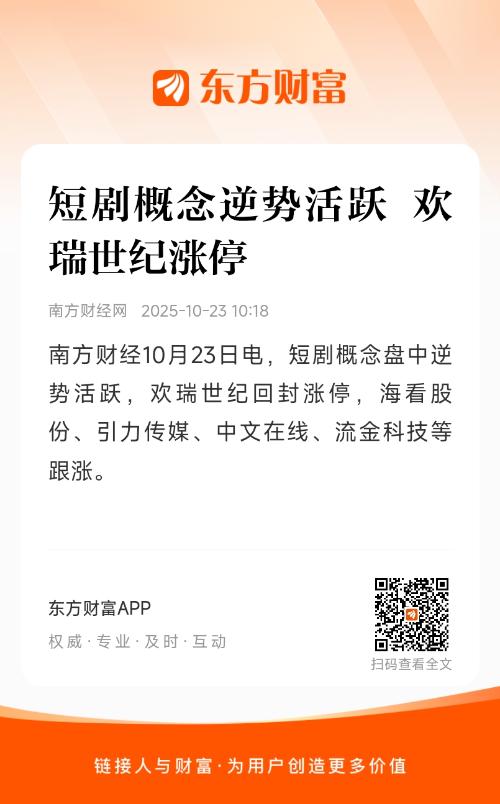 南方财经10月23日电,短剧概念盘中逆势活跃,欢瑞世纪回封涨停,海看股份、引力传媒、中文在线、流金科技等跟涨。