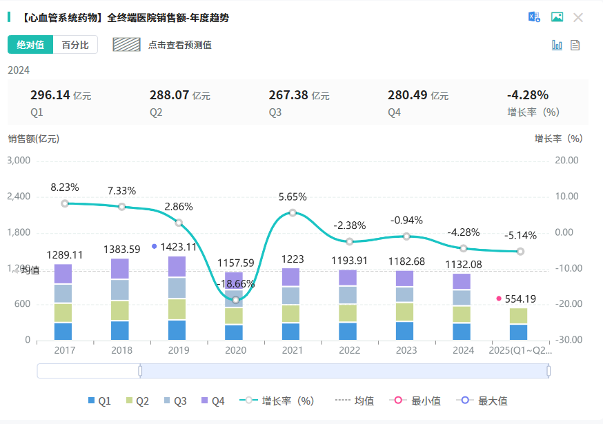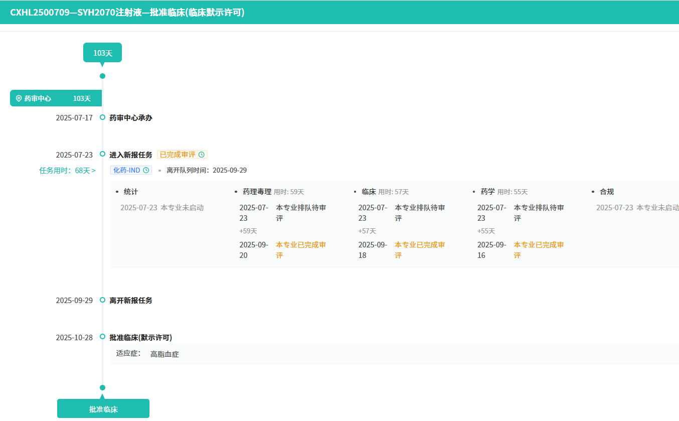 SYH2070注射液是石药集团自主研发的1类化药创新药,拟用于高脂血症,专攻ANGPTL3靶点。于2025年7月获CDE承办,9月30日获中国NMPA批准I期临床,10月9日获美国FDA批准,成为首款中美双批的ANGPTL3siRNA药,10月28日再获临床试验默示许可。据摩熵医药数据库显示,2024年心血管系统药物在全终端医院销售总额超1000亿元。