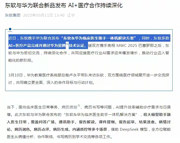 公开资料显示,在外部合作上,添翼2.0构建了“技术+临床”的双重协同网络,公司携手华为联合发布“东软&华为临床医生助手一体机解决方案”,同时,东软集团多款AI+医疗产品完成并通过华为昇腾技术认证;