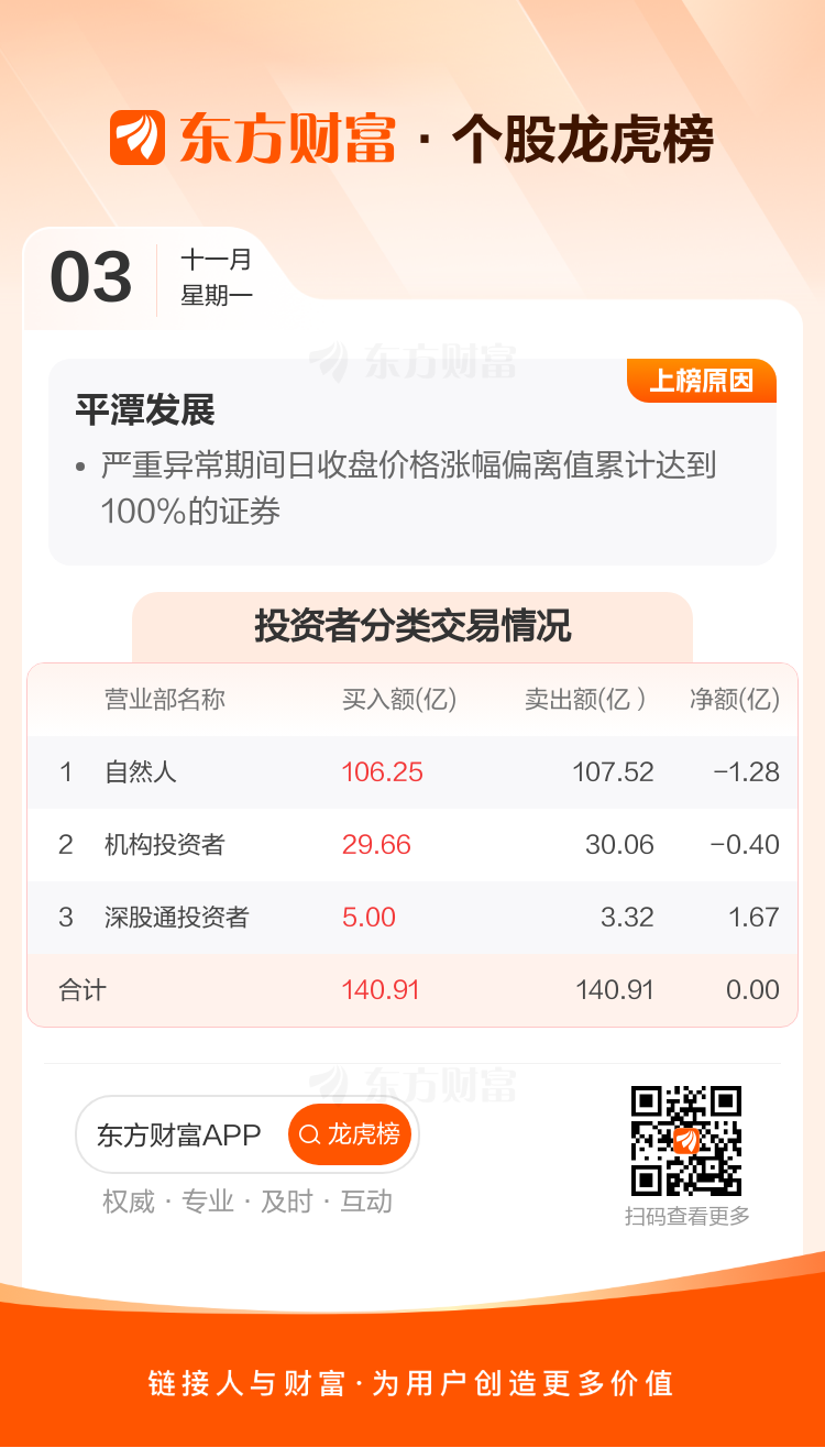 交易所2025年11月3日公布的交易公开信息显示,平潭发展因成为连续三个交易日内,涨幅偏离值累计达到20%的证券、严重异常期间日收盘价格涨幅偏离值累计达到100%的证券上榜。平潭发展当日收报7.79元,涨跌幅10.03%,换手率7.63%,成交额11.27亿。异常期间10月31日至11月3日,期间涨幅20.96%,累计偏离值20.85%,区间成交额46.16亿。严重异常期间10月23日至11月3日,期间涨幅107.73%,累计偏离值104.95%,区间成交额140.91亿。