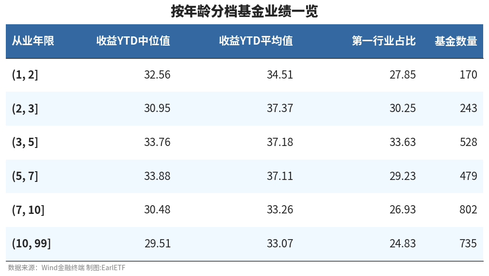 简单来看,开始管理基金的从业年限在1-7年的这批基金经理,表现要显著好于7年以上的老将们。