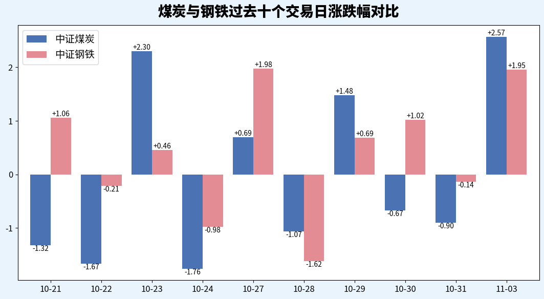 首先是涨跌幅。我印象中,煤炭和钢铁最近一直是跷跷板的味道,往往是一个好,另一个就要差点。