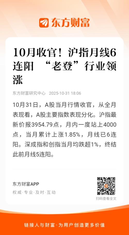 10月31日,A股当月行情收官,从全月表现看,A股主要指数表现分化。沪指最新价报3954.79点,月内一度站上4000点,当月累计上涨1.85%,月线已6连阳。深成指和创指当月均跌超1%,终结此前月线5连阳。