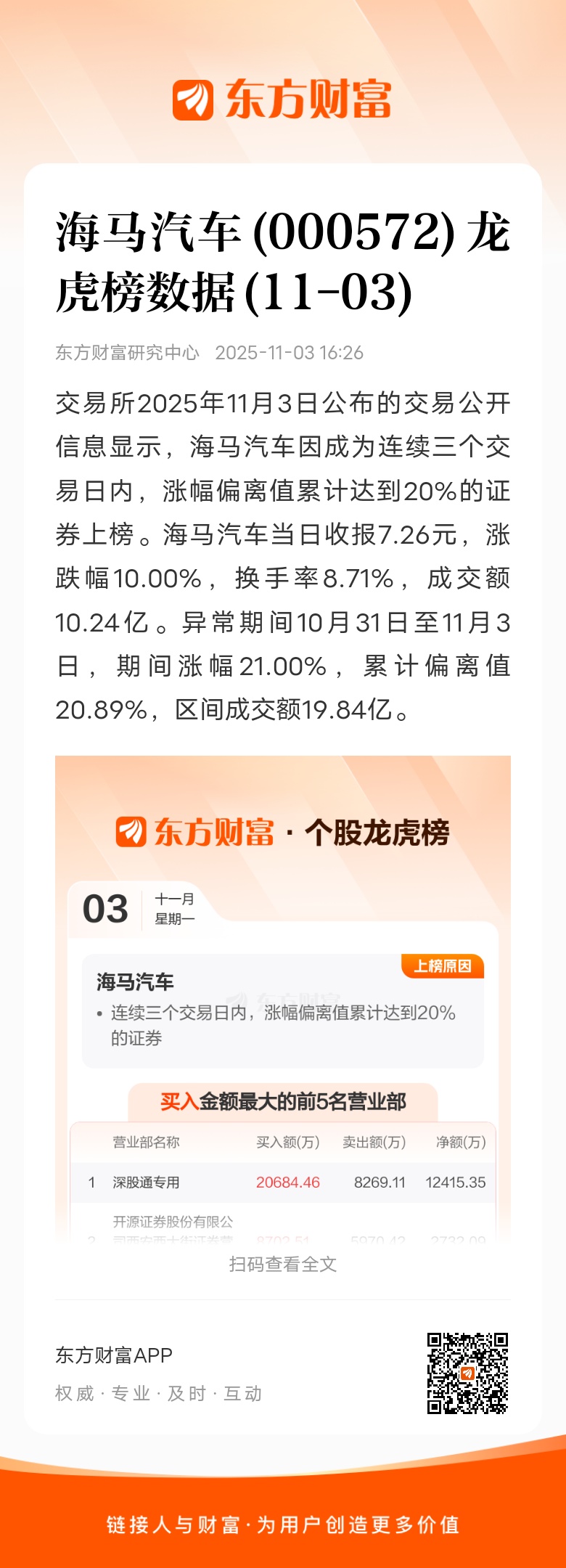 交易所2025年11月3日公布的交易公开信息显示,海马汽车因成为连续三个交易日内,涨幅偏离值累计达到20%的证券上榜。海马汽车当日收报7.26元,涨跌幅10.00%,换手率8.71%,成交额10.24亿。异常期间10月31日至11月3日,期间涨幅21.00%,累计偏离值20.89%,区间成交额19.84亿。