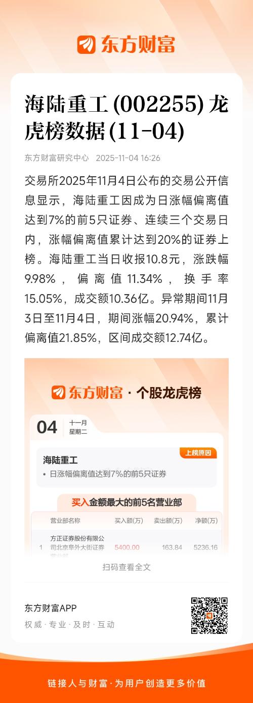 交易所2025年11月4日公布的交易公开信息显示,海陆重工因成为日涨幅偏离值达到7%的前5只证券、连续三个交易日内,涨幅偏离值累计达到20%的证券上榜。海陆重工当日收报10.8元,涨跌幅9.98%,偏离值11.34%,换手率15.05%,成交额10.36亿。异常期间11月3日至11月4日,期间涨幅20.94%,累计偏离值21.85%,区间成交额12.74亿。