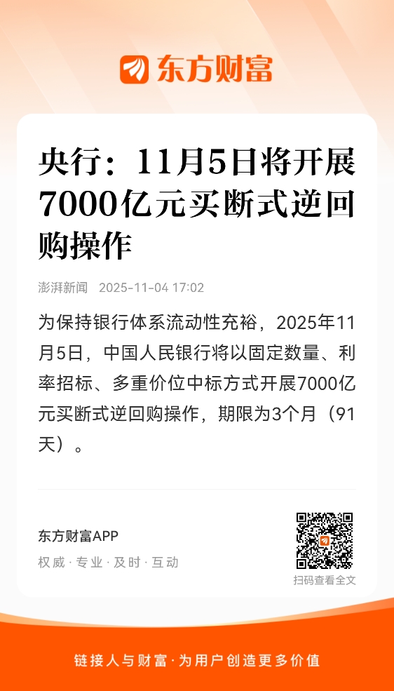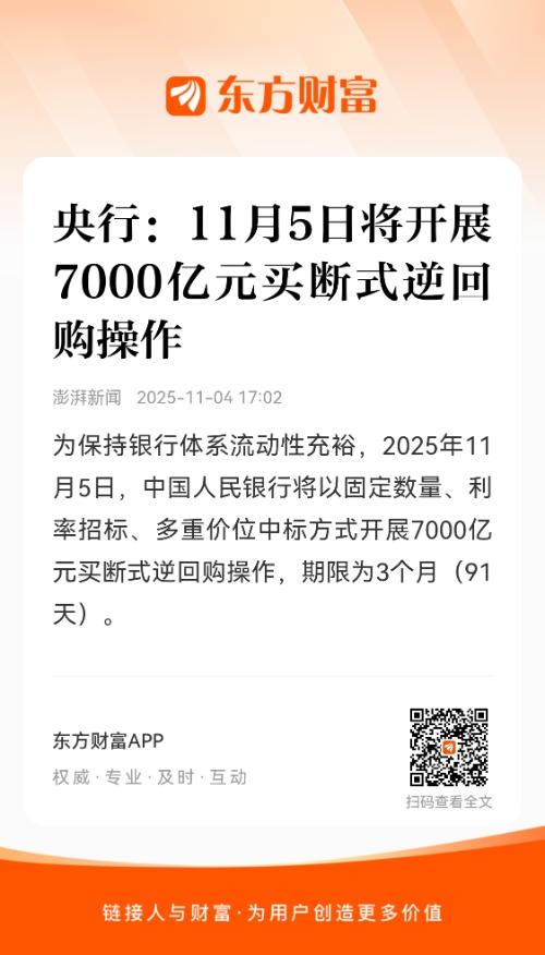 中国人民银行11月4日发布公开市场买断式逆回购招标公告称,为保持银行体系流动性充裕,2025年11月5日,将以固定数量、利率招标、多重价位中标方式开展7000亿元买断式逆回购操作,期限为3个月(91天)。