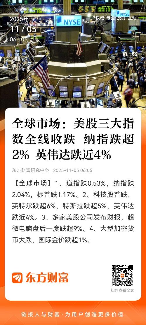 美股市场:美股三大指数11月04日收盘全线下跌。截至收盘,道琼斯工业平均指数比前一交易日下跌251.44点,收于47085.24点,跌幅为0.53%;标准普尔500种股票指数下跌80.42点,收于6771.55点,跌幅为1.17%;纳斯达克综合指数下跌486.08点,收于23348.64点,跌幅为2.04%。