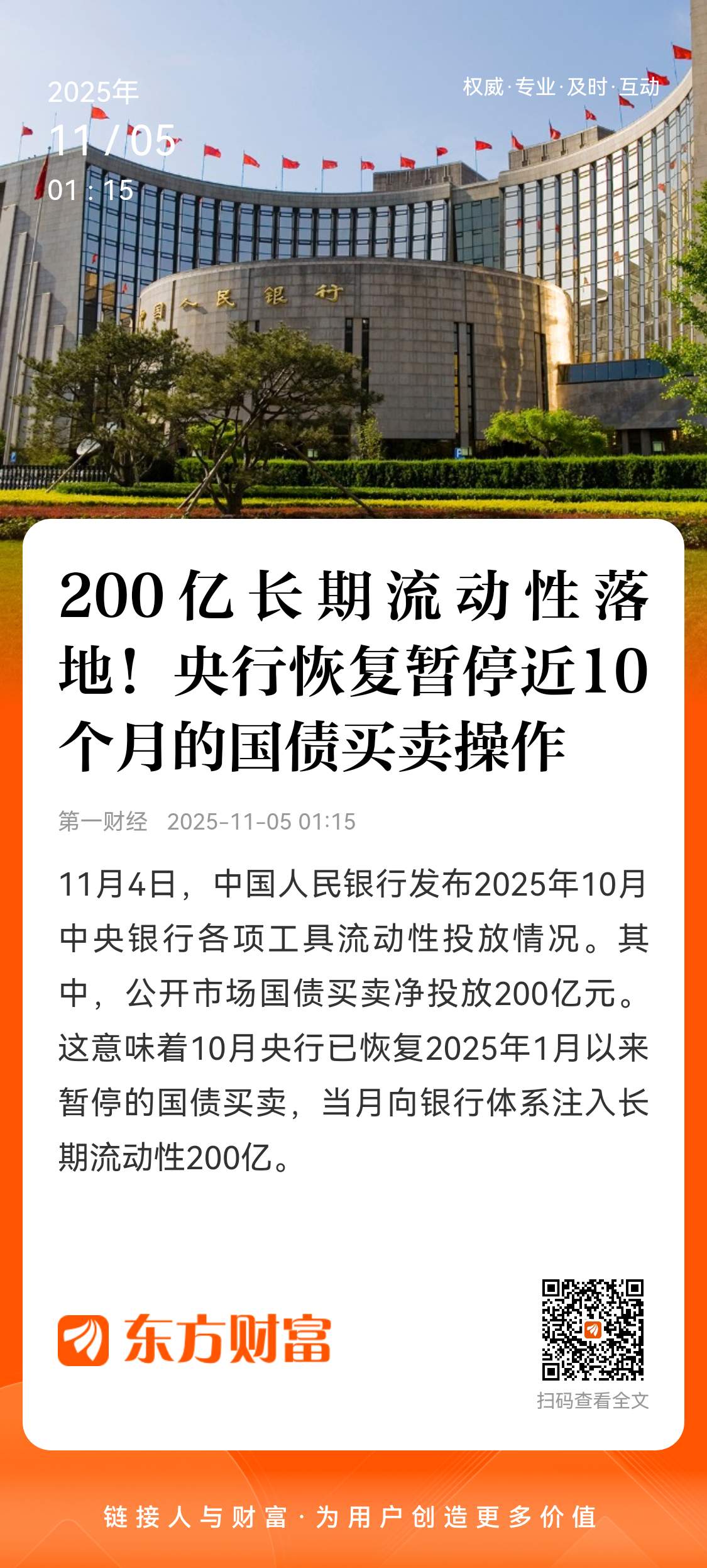 11月4日,中国人民银行发布2025年10月中央银行各项工具流动性投放情况。其中,公开市场国债买卖净投放200亿元。这意味着10月央行已恢复2025年1月以来暂停的国债买卖,当月向银行体系注入长期流动性200亿。