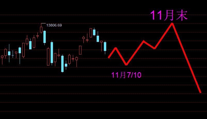 鉴于此,提出下面图形方案的备选走势,这波回踩不破新低,低点在11月7日或者10日出现,然后继续震荡反弹到11月末,开始出现一个跨年级别的回调行情。具体细分走势还是以日分时模型为准,边走边说。