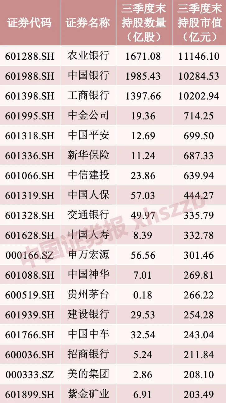 其中,农业银行、中国银行、工商银行是“国家队”资金三季度末持有市值最多的三只个股,分别持有1.11万亿元、1.03万亿元、1.02万亿元;中金公司、中国平安、新华保险、中信建投持有市值均在600亿元以上。