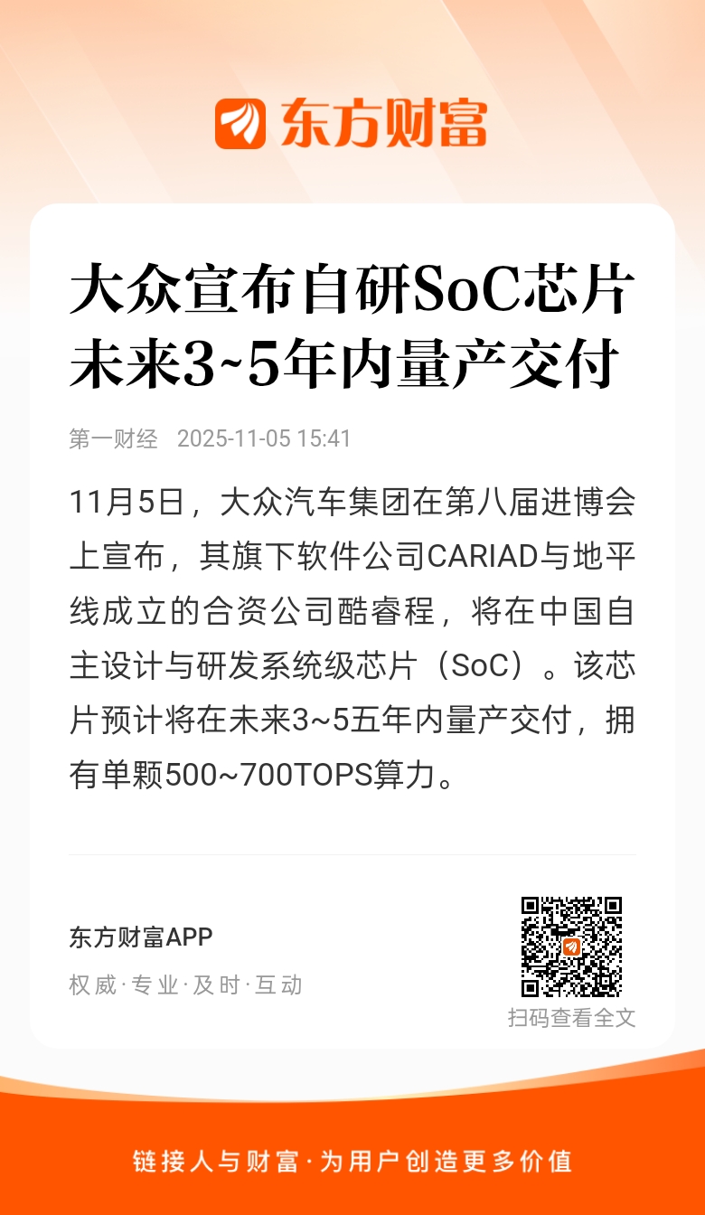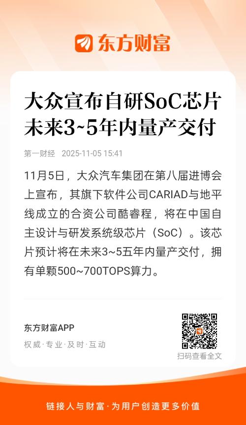 大众宣布自研SoC芯片 未来3~5年内量产交付第一财经57分钟前约42秒11月5日,大众汽车集团在第八届进博会上宣布,其旗下软件公司CARIAD与地平线成立的合资公司酷睿程,将在中国自主设计与研发系统级芯片(SoC)。该芯片预计将在未来3~5五年内量产交付,拥有单颗500~700TOPS算力。CARIAD中国CEO韩三楚表示,自研芯片是一次战略性投资,金额约为2亿美元。分享至:微信朋友圈微博郑重声明:东方财富发布此内容旨在传播更多信息,与本站立场无关,不构成投资建议。据此操作,风险自担。