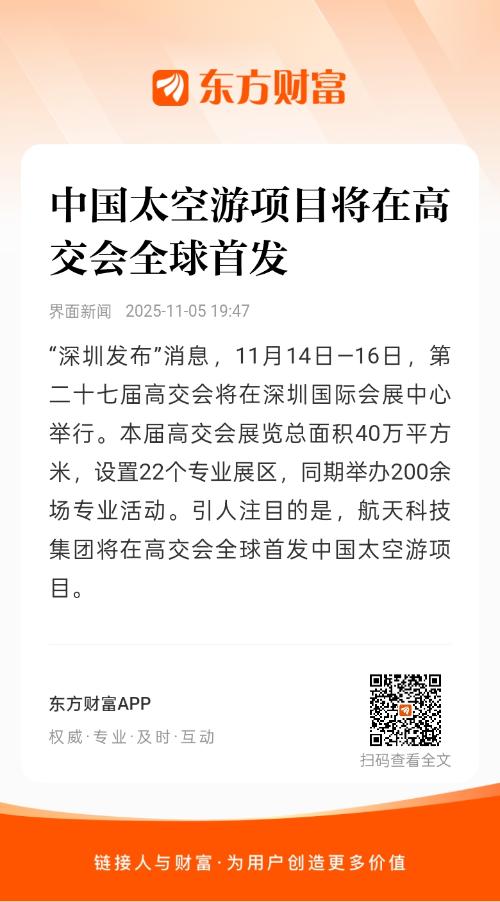 “深圳发布”消息,11月14日—16日,第二十七届高交会将在深圳国际会展中心举行。本届高交会展览总面积40万平方米,设置22个专业展区,同期举办200余场专业活动。引人注目的是,航天科技集团将在高交会全球首发中国太空游项目。