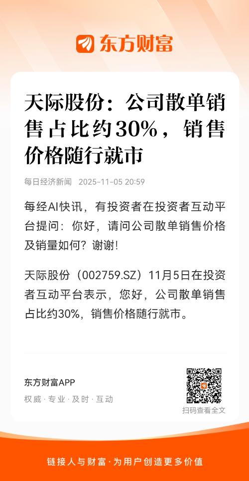 天际股份(002759.SZ)11月5日在投资者互动平台表示,您好,公司散单销售占比约30%,销售价格随行就市。