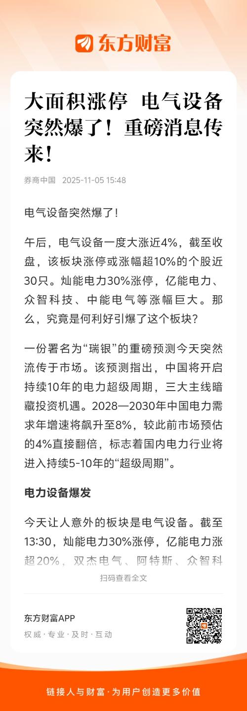 午后,电气设备一度大涨近4%,截至收盘,该板块涨停或涨幅超10%的个股近30只。灿能电力30%涨停,亿能电力、众智科技、中能电气等涨幅巨大。那么,究竟是何利好引爆了这个板块?