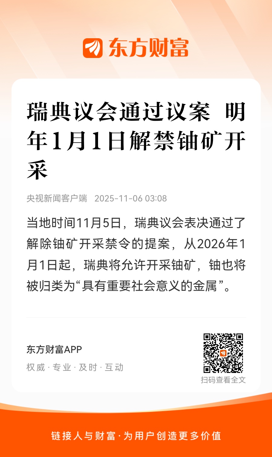 当地时间11月5日,瑞典议会表决通过了解除铀矿开采禁令的提案,从2026年1月1日起,瑞典将允许开采铀矿,铀也将被归类为“具有重要社会意义的金属”。