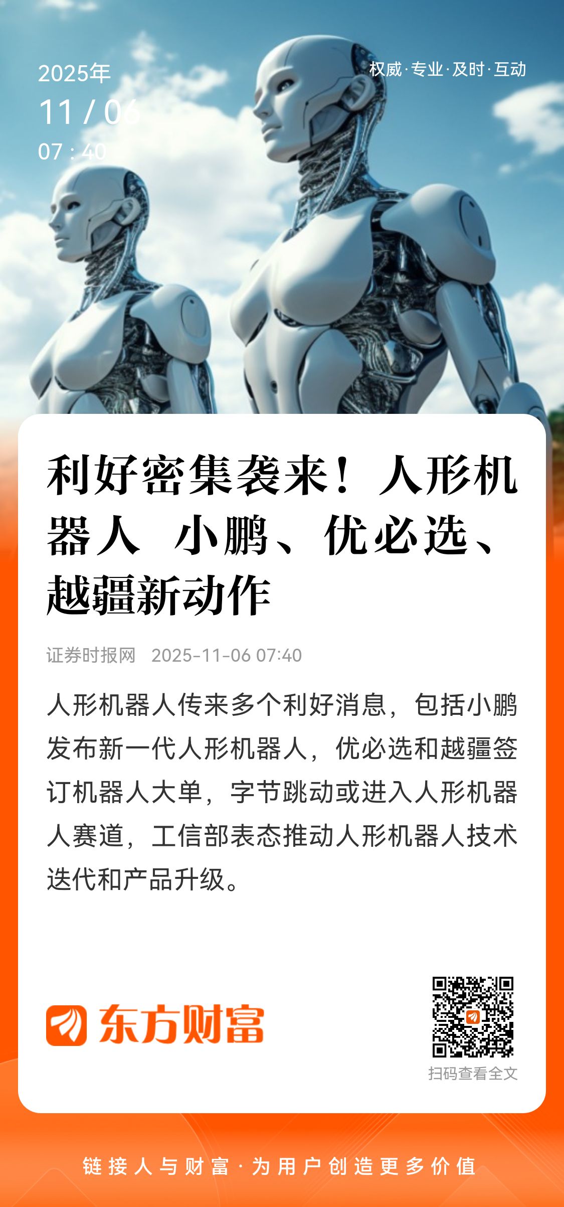 昨日(11月5日),人形机器人传来多个利好消息,包括小鹏发布新一代人形机器人,优必选和越疆签订机器人大单,字节跳动或进入人形机器人赛道,工信部表态推动人形机器人技术迭代和产品升级。