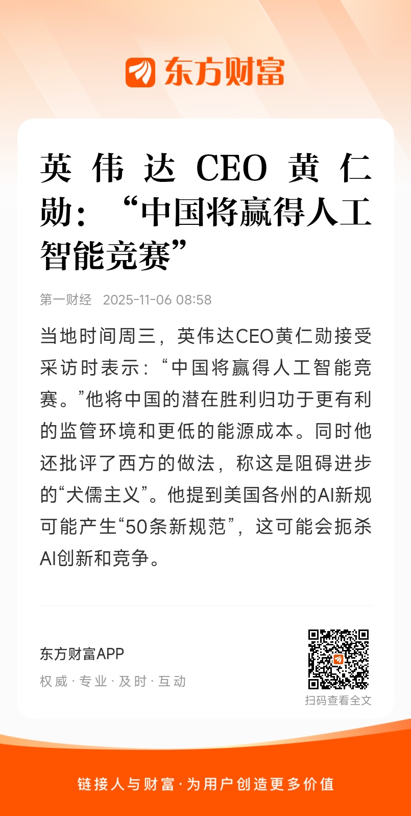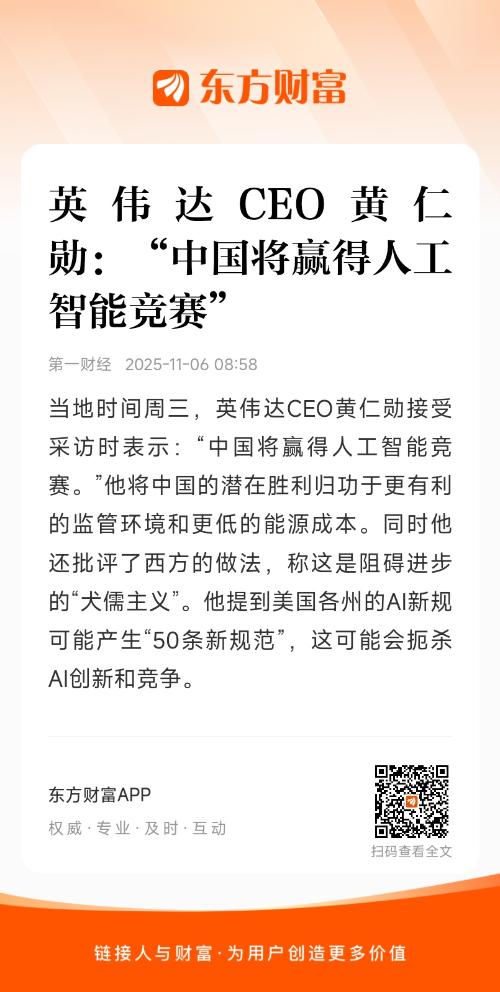 当地时间周三,英伟达CEO黄仁勋接受采访时表示:“中国将赢得人工智能竞赛。”他将中国的潜在胜利归功于更有利的监管环境和更低的能源成本。同时他还批评了西方的做法,称这是阻碍进步的“犬儒主义”。他提到美国各州的AI新规可能产生“50条新规范”,这可能会扼杀AI创新和竞争。