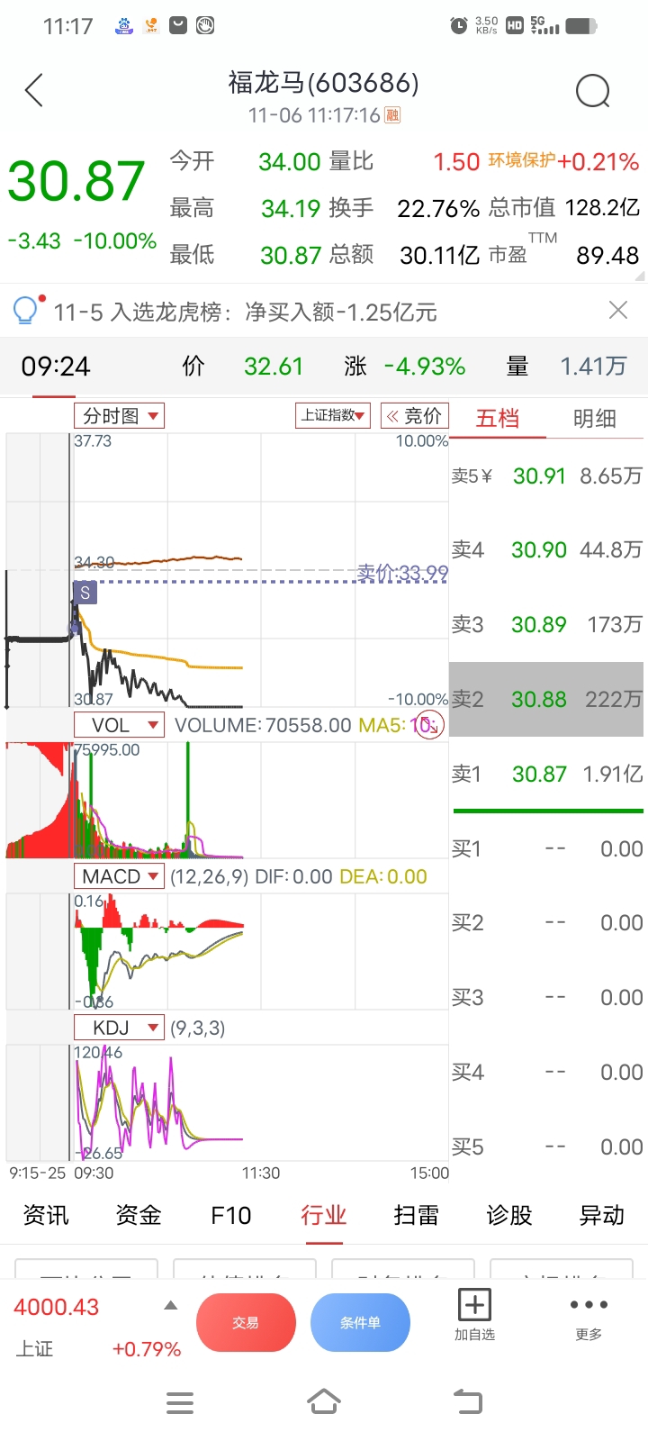 今天大盘对st不友好,被套了好几支,吃面的一天,福龙开盘价位置走了。