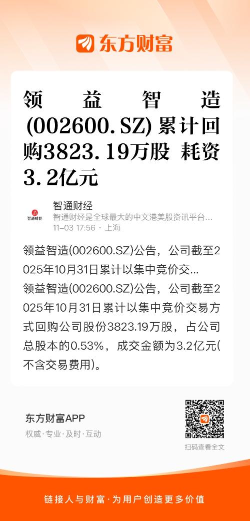领益智造(002600.SZ)公告,公司截至2025年10月31日累计以集中竞价交易方式回购公司股份3823.19万股,占公司总股本的0.53%,成交金额为3.2亿元(不含交易费用)。