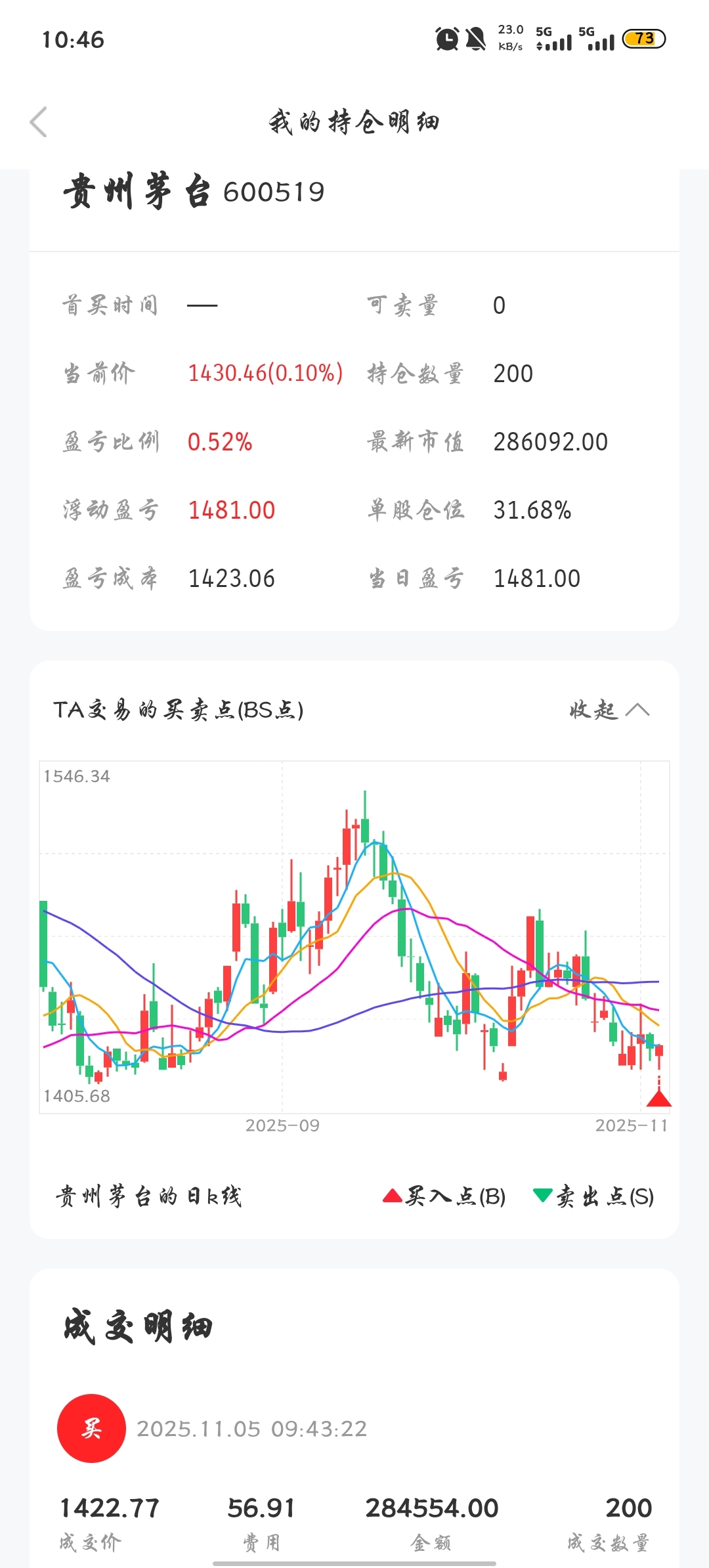 果断在9点43分,以1422.77的价格梭哈了200股(别问我为啥不多买,钱包不允许啊…)。