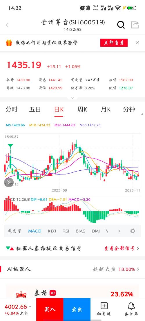 早上瞅着盘面,茅台在1420附近晃悠,这位置离我之前盯的支撑位很近。再看MACD指标,绿柱都快缩没了,感觉机会来了!