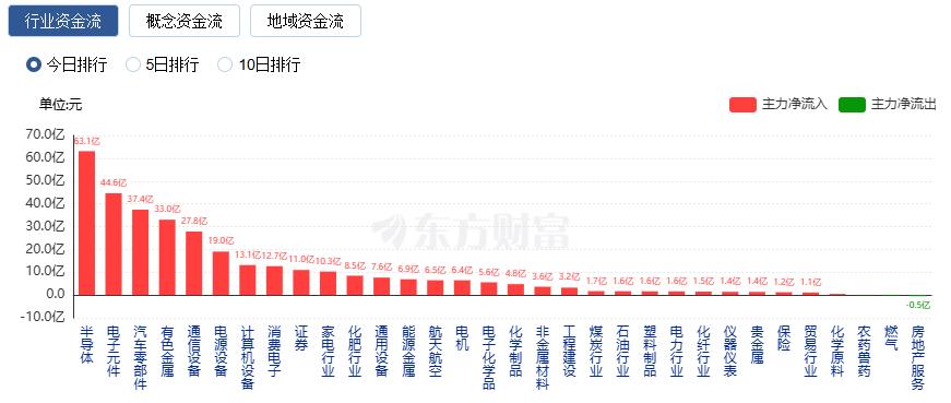 行业资金方面,截至收盘,半导体、电子元件、汽车零部件等净流入排名靠前,其中半导体净流入63.09亿。